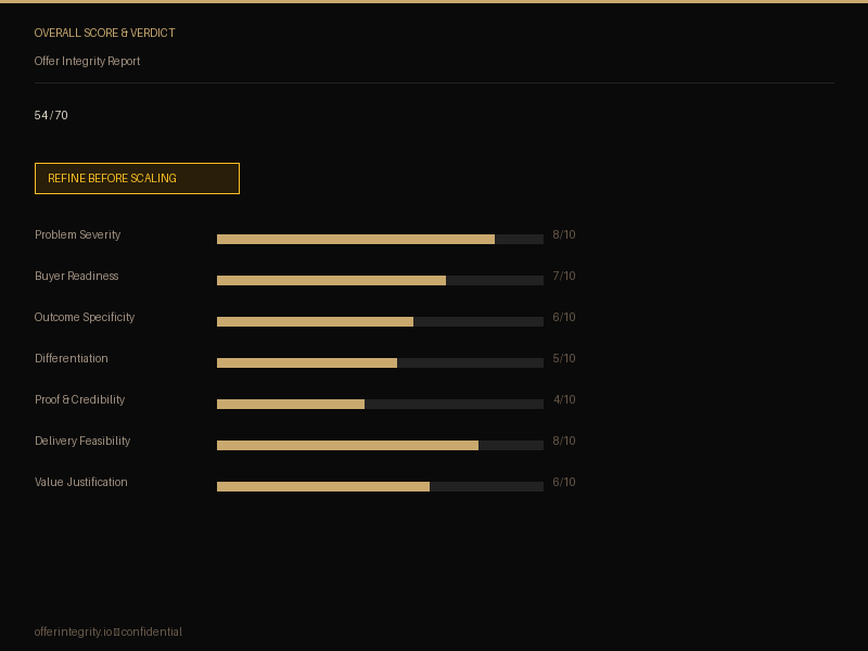 Beta feedback“Before spending on a launch, I put my offer through this. Came back 'Refine Before Scaling.' Painful — but the 30-day action plan gave me a clear fix. Re-launched 6 weeks later with a much stronger close rate.”
