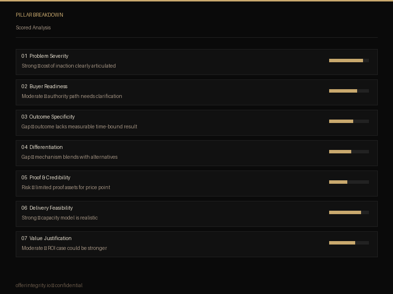Validate your $2k–$20k coaching or consulting offer before you launch. Get a structured 7-pillar scorecard plus a prioritized 30-day action plan.