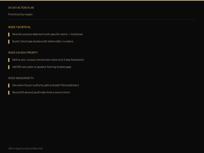 A scored verdict plus a 30-day action plan tells you exactly what to fix and in what order.